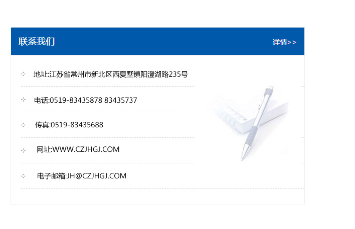 傳真:0519-83435688    郵編:213135    網址:WWW.czjhgj_com.mou-bai.com    電子郵箱:JH@czjhgj_com.mou-bai.com